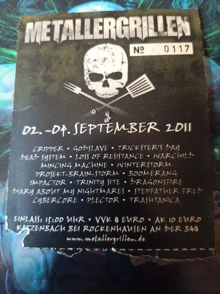 Wie habe ich die Band kennengelernt: Man schrieb das Jahr 2011, ich war das erste mal auf dem Metallergrillen. Ich kannte eine einzige Band, die dort auftrat, Cripper, aber Godslave haben mich sofort begeistert. Später, im nächsten Jahr bei einem Konzert in der Garage, habe ich mich dann mal mit CD’s eingedeckt und seit dem bin ich der Band verfallen. UND JA, es war 2011 auf dem Metallergrillen, auch wenn ihr es mir nicht glauben wollt. Darum kommt auch ein Bild vom Ticket hier drunter.