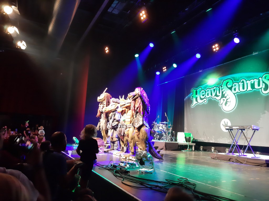 Was mir gleich aufgefallen ist, die Lautstärke bleibt weit hinter anderen Konzerten zurück, selbst im Vergleich zu Gigs in Kneipen oder irgendwelchen Kellern. Nach einem gesprochenen Intro Text kamen die Dinos auf die Bühne und haben gleich losgelegt. Die Musik ist ziemlich simpler Rock/Heavy Metal mit Texten die zwar Kinder ansprechen, bei denen aber auch die älteren Kinder, solche mit Vollbart und Bierbauch, ihren Spaß haben können. Wie zu erwarten gab es auch einiges an Interaktion mit dem Publikum, sodass die Kinder immer wieder animiert sind mitzumachen. Da haben die kleinen Metalheads auch richtig gut gemacht, wozu auch die Songauswahl beigetragen hat. Und natürlich auch die Kostüme.