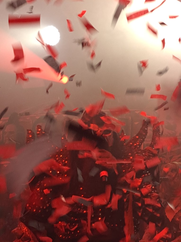 Zwischen den Liedern gab es immer ausschweifende Ansagen, aber auch diese hatten einen hohen Unterhaltungswert, besonders, da seine deutschen Lieblingswörter wohl „Scheiße“ und „Ja ja“ sind. Bei letzterem hat er auch für die ganz Doofen die Bedeutung erklärt. Das wurde vom Publikum auch immer als Bestätigung verlangt. Was die Songauswahl angeht, gibt es nichts zu meckern. Sie spielten einiges an „old Scheiße“ unter anderem auch meinen Lieblingssong von ihnen (Blood Red Sandman) aber auch „Neue Scheiße“ wie den Neuzugang zu meiner Weihnachtsplayliste (Merry Blah blah blah). Der einzige Kritikpunkt den ich habe, betrifft das Kunstblut, das mittels einer „Kreissäge“ ins Publikum gespritzt wurde. Zu wenig und zu durchsichtig. Dabei hatte irgendwer sogar ein Warnschild angebracht, dass darauf hinwies, dass man in den vorderen Reihen nass oder mit Kunstblut bespritzt würde.