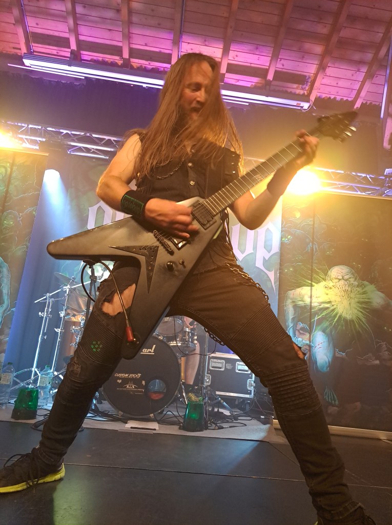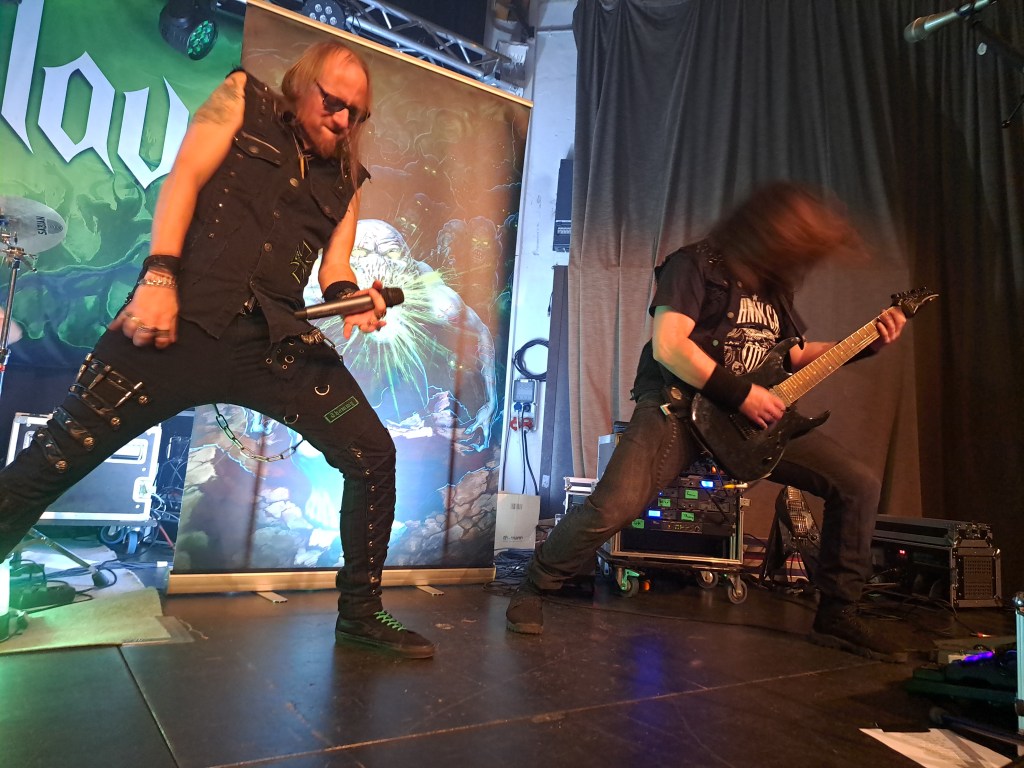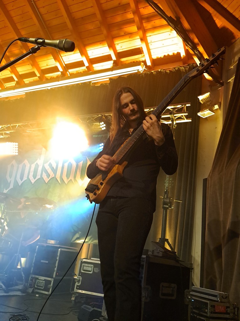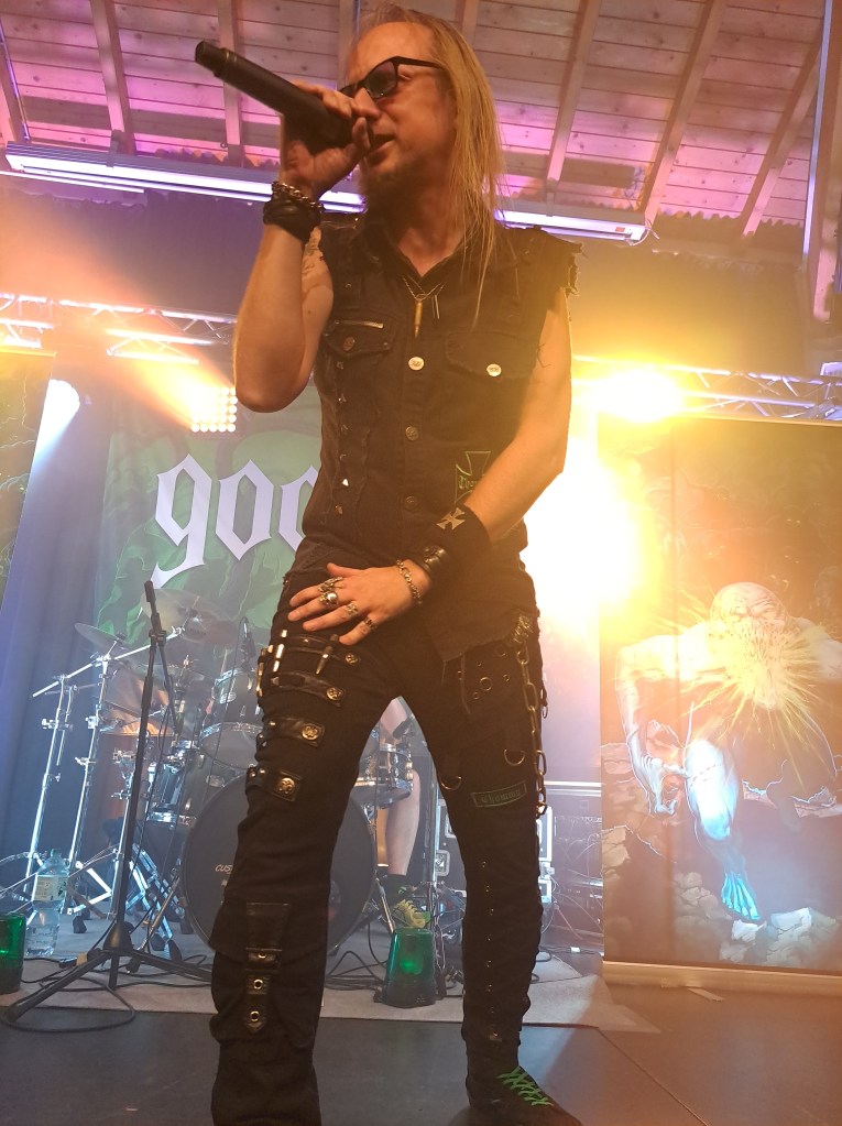 Danach sollten eigentlich BLESSED HELLRIDE kommen, aber wegen krankheitsbedingtem Drummermangel mussten sie absagen. Also kamen dann schon GODSLAVE, die auch unter einem Ausfall gelitten haben. So war der Sound etwas dünn, da Mika der Bassist auch wegen Krankheit ausfiel. Trotzdem haben sie, wie immer, richtig Gas gegeben. Die Setlist war auch wie immer solide, eine bunte Mischung aus alten und neueren Liedern. Auch einige meiner Lieblinge und das für mich wichtige „Show me your Scars“ waren vertreten. Für mich lohnt es sich immer, einen Gig von Godslave zu besuchen. Zum Schluss, bei „Vodcarnivore“ haben sie Tobi mit seiner Schießbude alleine gelassen, um vom Publikum aus zu spielen. Zum traditionellen Rausschmeißer sage ich nichts.