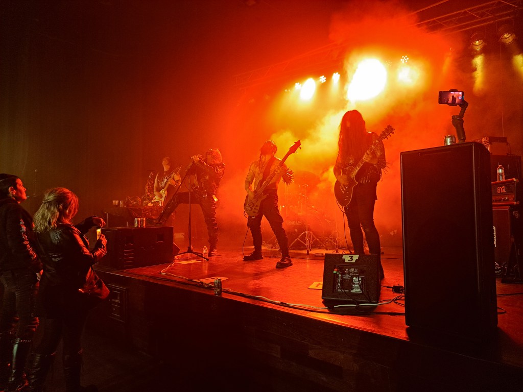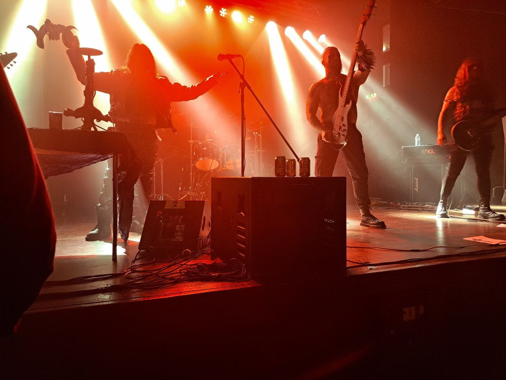 Das Festival: Das Kulturhaus ist ziemlich genau so, wie man sich so ein Gebäude vorstellt. Es gibt einen Eingang, dann einen Flur, indem hier die Merch-Stände aufgebaut waren und dann die „Konzerthalle“ die im hinteren Bereich ansteigt und dort Tische und Stühle bereit hält, für jene die nicht stehen wollen. Über die Architektur des ganzen schweige ich mich an dieser Stelle aus. Das ganze war aber mitten in einem Wohngebiet. Also hatten die Anwohner den ganzen Abend Horden von Metalheads in ihrer Umgebung, was einerseits amüsant ist, andererseits, sollte es zu längeren Verzögerung kommen, hätte es dafür sorgen können, dass die späteren Bands nicht auftreten könnten. Es ist aber alles gut gegangen.