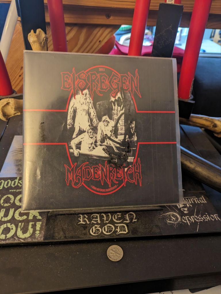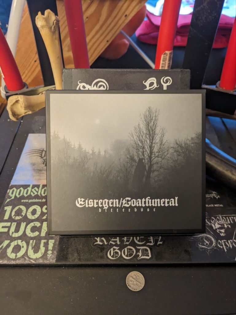 Zusammen mit ihrem Nebenprojekt, einem von vielen, Goatfuneral hat Eisregen ein ganzes, „Bitterböse“s, Split-Album veröffentlicht. Die Eisregen CD ist, wie gewohnt. Düstere Musik, blutige Texte, von denen ich Heute ist Krüppelnacht hervorheben will. Bei diesem Lied haben sie sich überlegt, wie sieht wohl jemand aus, der für Regierungen die Drecksarbeit verrichtet. Das Ergebnis wurde ein harter, rasanter Song, der auch heute noch regelmäßig durch meine Ohren schneidet. Auch Ein Pfund Fleisch kann sich hören lassen. Ob das Lied von Shakespeare oder John Kramer inspiriert ist, das müsste man die beiden fragen. Die andere CD gehört ganz Goatfuneral. Hier zeigen sie, dass sie auch reinen Black Metal drauf haben, auch wenn mir der Sound etwas zu poliert ist. Ein Blick lohnt sich für Fans von Eisregen.