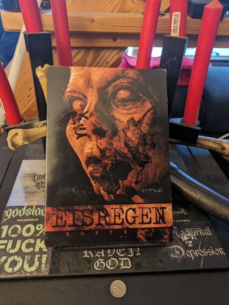 Knapp einen Monat später kam dann das Album „Rostrot“. Für mich das beste Album der zweiten Phase von Eisregen. Hier haben sie die stärksten, nicht die eingängigsten, Lieder und haben zu alter Härte zurückgefunden, ohne einen Rückschritt zu machen. Alles ist wie aus einem Guss, ohne sich zu wiederholen. Nur ein Lied stört mich hier. Es ist das Comedy-Lied Kathi das Kuchenschwein. Aber wenn man davon absieht, dann kann sich dieses Album mit den alten Klassikern messen. Mit dem Schakal – Ode an die Streubombe haben sie sich einmal vom zweiten Weltkrieg wegbewegt und nach Vietnam begeben. Mit Ich sah den Teufel werden sie sogar philosophisch und der Blutvater erzählt eine Geschichte aus Krieg und Blut, die sich zwar nicht historisch einordnen lässt und deshalb auf jeden kriegerischen Stamm passt, der jemals das Schwert ergriffen hat.