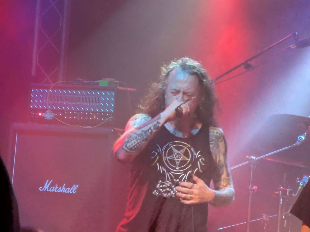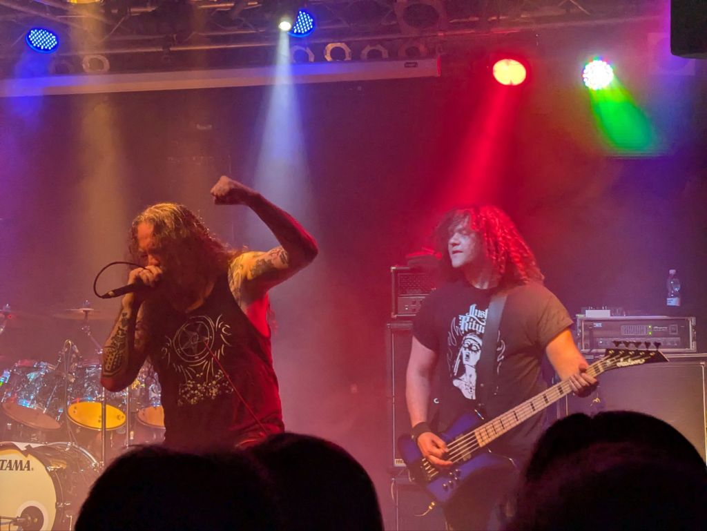 Das Konzert: Da es nachts doch ganz kühl wird, wurde die innere Bühne bespielt. Ein recht großer Saal mit einigen Stützpfisten, die leider die Pitbildung erschwert haben. Auf der einen Seite die Bühne, auf der anderen die Bar. Die Raucher mussten sich nach draußen verkrümeln, wo auch der Merchstand aufgebaut war. Bevor wir aber zum wichtigen kommen, zwei Kritikpunkte: Die Tour hätten sie viel besser benennen können, nämlich „Master of the Jungle Rot Benediction. Vielleicht beim nächsten Mal. Der andere Kritikpunkt, für den die Bands nichts können ist der, dass zu viele Tickets verkauft wurden. Obwohl die Halle gedrängt voll war, hatten sich draußen noch diverse Leute versammelt und auch um die beiden Türen gedrängt. Aber, kommen wir zum wichtigen, den Bands: